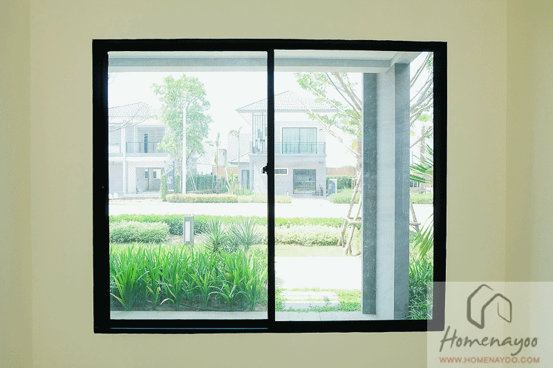 ห้องนี้มีหน้าต่างบานเลื่อน กรอบอลูมิเนียมสีดำ ลูกฟักกระจกเขียวตัดแสง เปิดออกหลังบ้านค่ะ