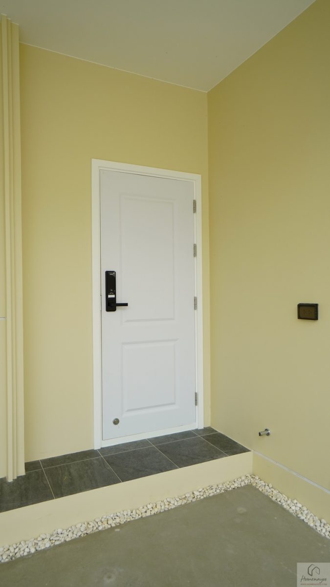 หน้าประตูบ้านมีเฉลียงแบบในร่มไว้ถอดรองเท้า วางม้านั่งได้ ด้านหน้าดีไซน์เป็นเสาคู่ด้านหน้าพร้อมตกแต่งด้วยไฟกริ่งเข้ากับตัวบ้าน
