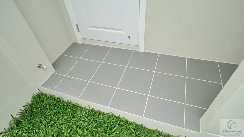 ส่วนซักล้างในร่มพื้นปูกระเบื้องเซรามิก เตรียมพื้นที่ไว้ให้วางเครื่องซักผ้า อบผ้า เดินระบบน้ำไว้รองรับ ด้านในมีประตูเชื่อมเข้าออกส่วนครัวในบ้านได้