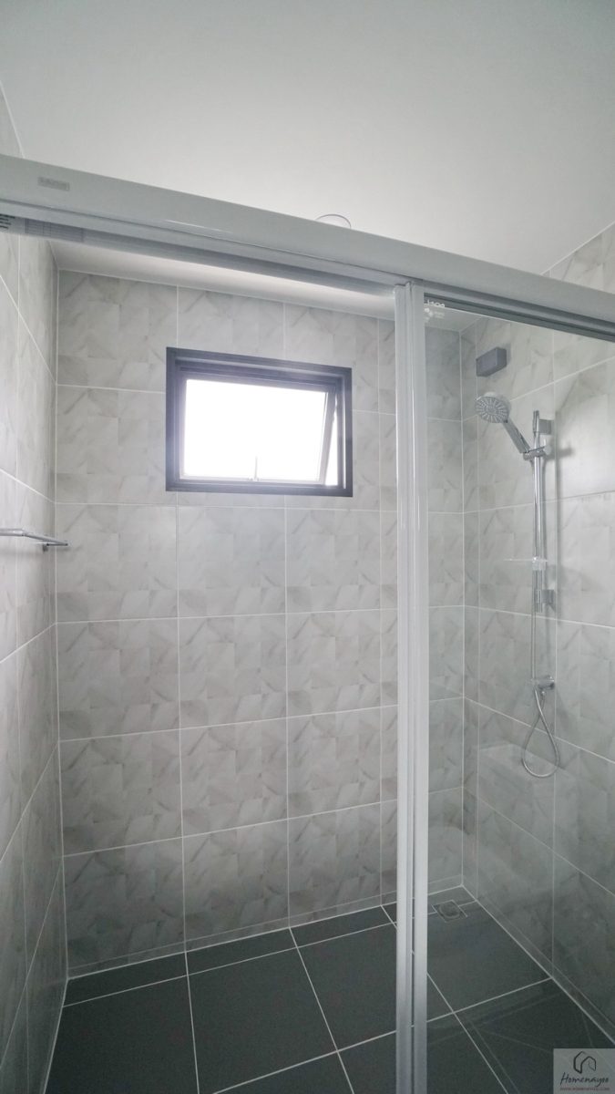 ถัดไปเป็นพื้นที่ส่วนเปียก ติดตั้งฉากกั้นอาบน้ำแบบบานเลื่อนมาให้ ด้านในติดตั้ง Hand Shower พร้อมเดินงานระบบไฟฟ้า ติด Junction Box รองรับการติดตั้งเครื่องทำน้ำอุ่นมาให้เรียบร้อย ในห้องน้ำมีช่องแสงเป็นบานกระทุ้งเปิดระบายอากาศได้