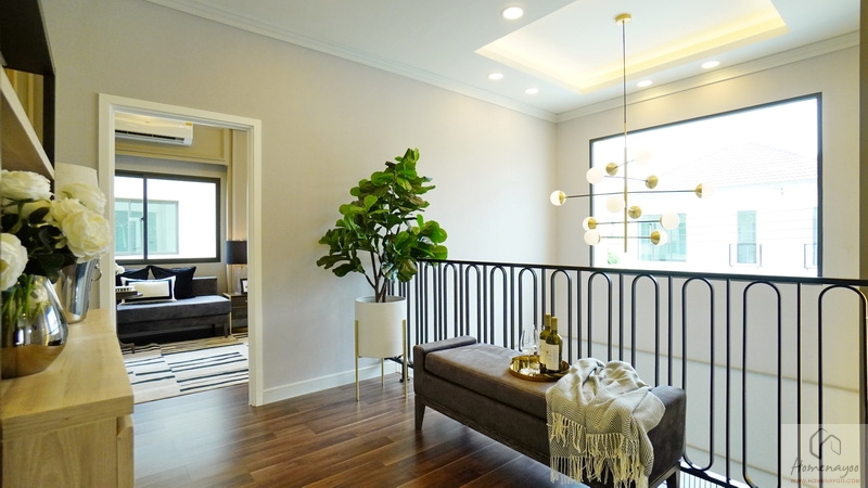 กลับมาที่บ้านตัวอย่าง ขึ้นมาที่ชั้น 2 จะเจอโถงบันไดก่อน และเชื่อมต่อกับพื้นที่พักผ่อนชั้นบน พื้นชั้นบนเป็นลามิเนตหนา 8 มม. ฝ้าเพดานสูง 2.8 ม.