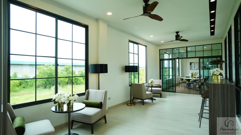 พื้นที่พักผ่อนวางเป็นโซฟา หรือ Lounge Chair ได้ บ้านตัวอย่าง ทำเป็นมุมเครื่องดื่มมาให้ดู ส่วนนี้ผนังจะเปิดโล่งเชื่อมกับช่อง Void และมีราวกันตกไว้ให้