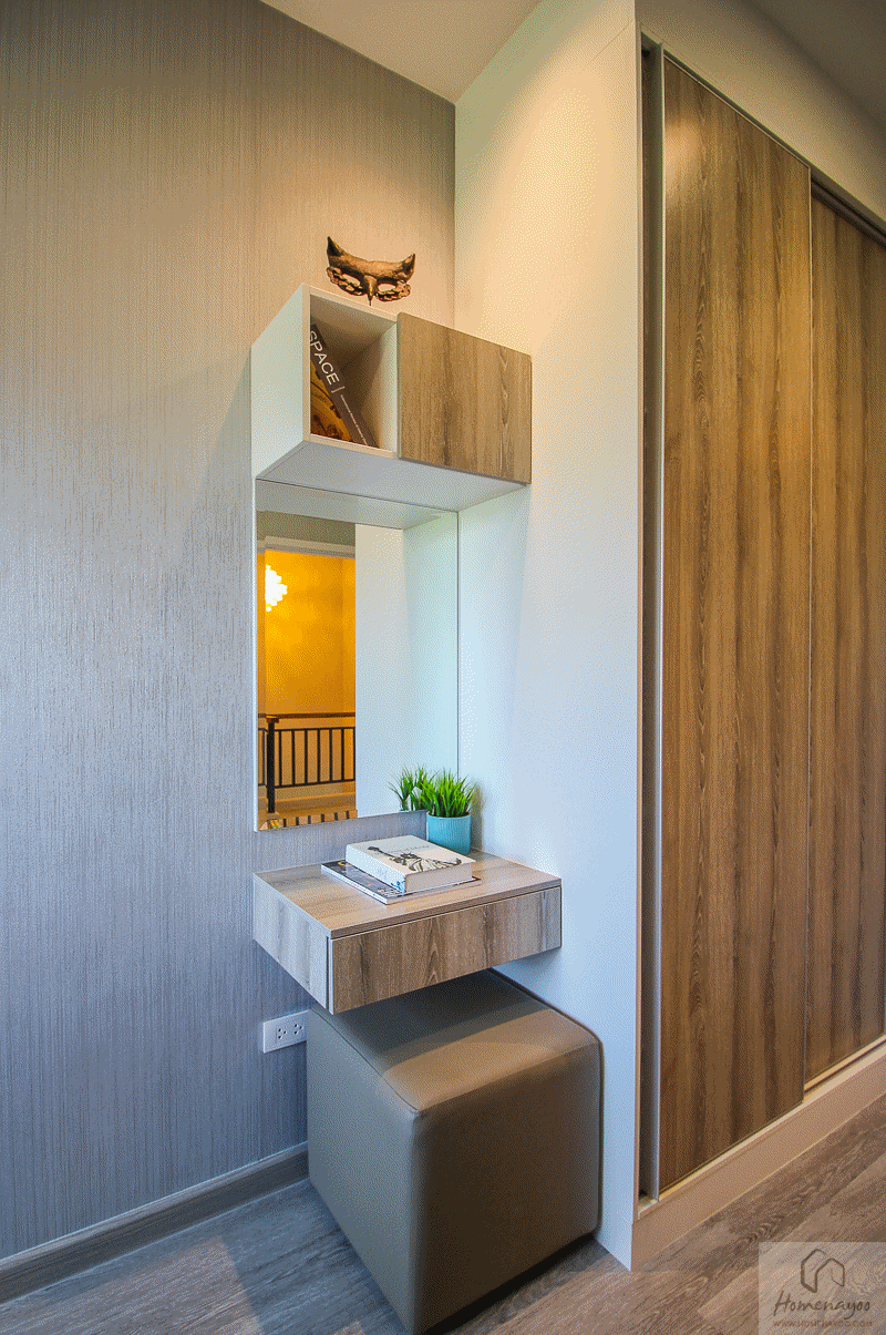 ด้านหลังชั้นวางทีวีออกแบบให้เป็นห้องแต่งตัว มีตู้เสื้อผ้า และโต๊ะเครื่องแป้งให้