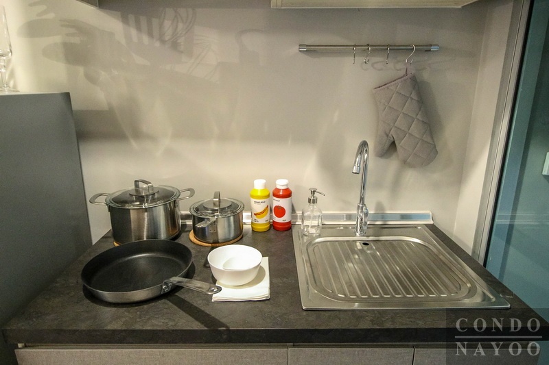 เคาน์เตอร์ครัวที่ทางโครงการติดตั้งมาให้เป็นรูปแบบเดียวกันกับห้องขนาด 28.00 ตร.ม. ทุกประการ แต่ห้องนี้จะมีพื้นที่ว่างด้านข้างกว้างขึ้นมาอยู่ที่ 1.2 เมตร สามารถวางตู้เย็นเครื่องใหญ่ 6-10 คิวได้ ถ้าหากวางเป็นตู้เย็นขนาดปกติ 6-8 คิว ก็จะมีพื้นที่เหลือใช้งานอีกนิดหน่อย สามารถวางเป็นชั้นวางของแบบมีล้อเลื่อน หรือ จะวางถังขยะใบใหญ่แบบห้องตัวอย่างก็ทำได้เลยค่ะ