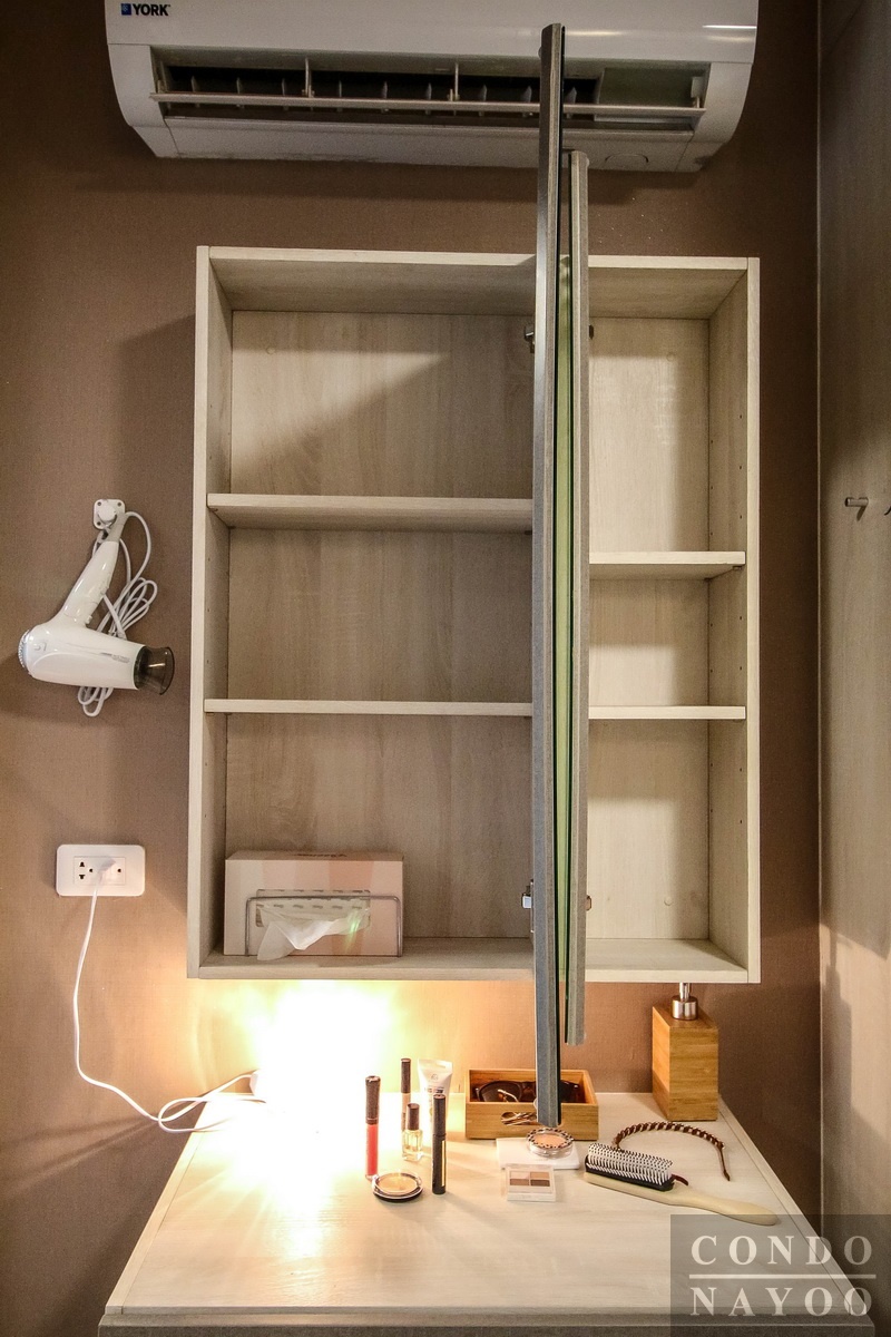 โต๊ะเครื่องแป้งแบบบิวท์อิน พร้อมลิ้นชักเก็บของ พื้นที่ใช้งานหน้าโต๊ะ ขนาด 70 x 50 ซม. วางเครื่องสำอาง, ของใช้ต่างได้กำลังพอดีค่ะ ผนังมีตู้เก็บของหน้าบานกระจกเงาให้แบบในภาพ ด้านข้างมีเต้าเสียบปลั๊กไฟ รองรับการเสียบไดร์เป่าผม หรือ เสียบเครื่องโกนหนวดไว้ให้ 1 จุดค่ะ