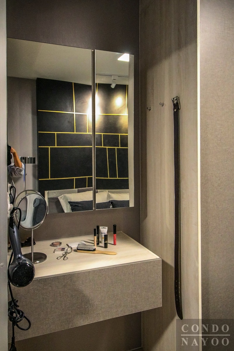 โต๊ะเครื่องแป้งลายไม้สีอ่อน พร้อมลิ้นชักเก็บของ และ ตู้เก็บของหน้าบ้านกระจก ผนังข้างตู้เสื้อผ้ามีหมุดแขวนของมาให้อีก 3 จุดด้วยกัน