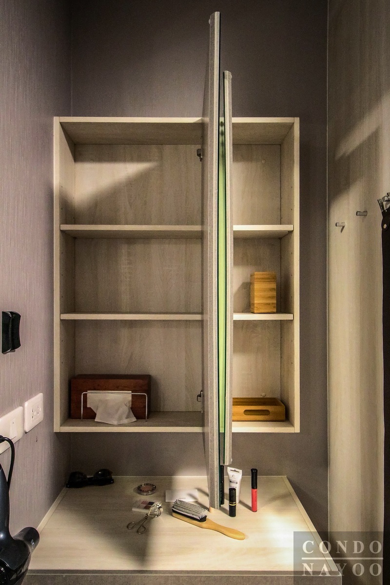 ตู้เก็บของแบบบานเปิด 2 ช่อง ด้านในมีชั้นลอยให้ฝั่งละ 3 ชั้น ผนังด้านข้างเป็นตำแหน่งของสวิตซ์ไฟ และ เต้าเสียบปลั๊กไฟ