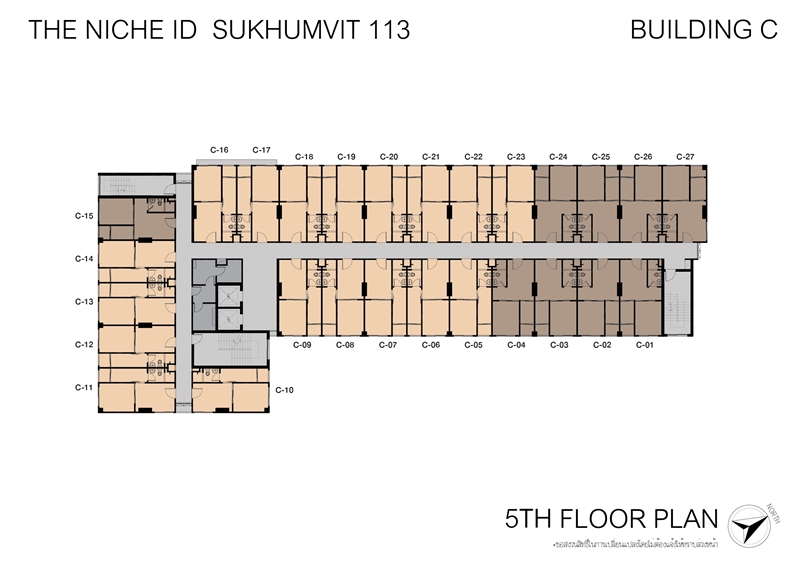 5th-6th Floor Plan อาคาร C เป็นห้องพักอาศัยทั้งชั้นรวม 27 ยูนิต แบ่งเป็น Type A (สีน้ำตาล) จำนวน 9 ยูนิต และ Type B (สีครีม) มีจำนวน 16 ยูนิต