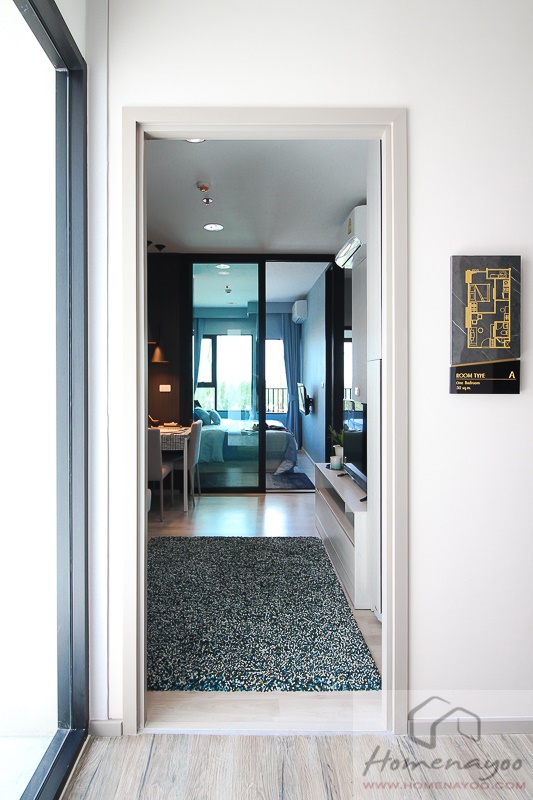 เข้ามาภายในห้องจะเป็นโถงทางเดินเชื่อมสู่ห้องครัวและ Common Area พื้นห้องปูด้วยลามิเนตหนา 8 มม. ผนังฉาบเรียบทาสี ฝ้าเพดานในห้องสูง 2.7 เมตร เป็นฝ้าฉาบเรียบติดดวงโคมดาวน์ไลท์หลอด LED พร้อม Heat Detector, Smoke Detector และ Sprinkle ส่วนเครื่องปรับอากาศจะมีให้ 3 เครื่อง ติดเอาไว้ภายใน Common Area 1 ตัวและภายในห้องนอนอีกห้องละ 1 ตัว