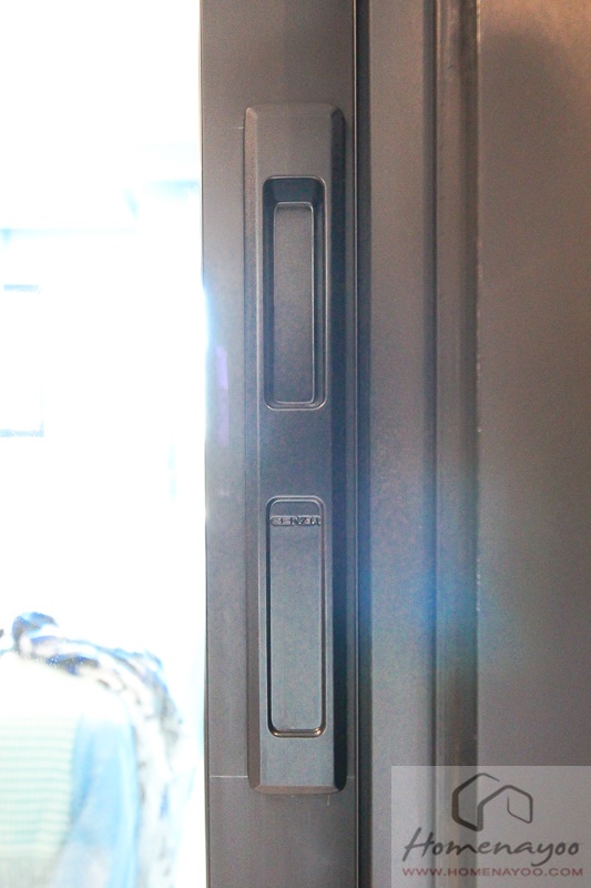 เราเข้าไปดูห้องครัวกันต่อค่ะ ห้องครัวจะกั้นส่วนออกไปด้วยประตูบานเลื่อน 3 ตอนกรอบอลูมิเนียมติดกระจกเขียวตัดแสงแบบนี้