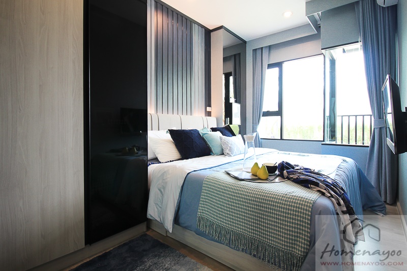 พื้นที่ปลายเตียงก็ยังเหลือสามารถเดินผ่านหรือเปลี่ยนผ้าปูที่นอนได้สะดวก ผนังฝั่งปลายเตียงที่เซ็ทเข้าไปสามารถวางชั้นวางทีวีเพิ่มเติมได้ด้วยนะ