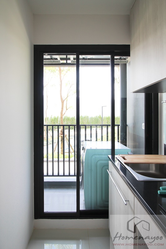 จากห้องครัวจะอยู่ติดกับส่วนระเบียงค่ะ กั้นด้วยประตูบานเลื่อนกระจก 3 ตอนเหมือนกัน