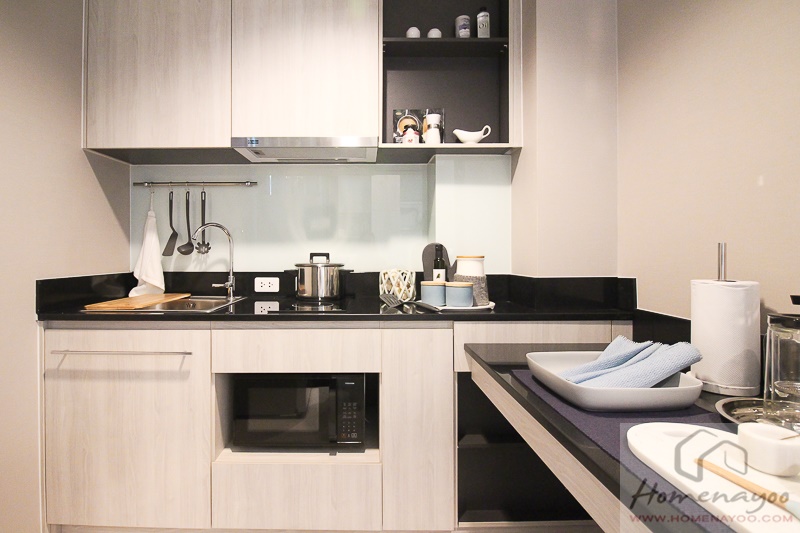 เคาน์เตอร์ครัวใช้ท็อปหินสังเคราะห์สีดำหน้าบานปิดผิวด้วยเมลามีน ใต้เคาน์เตอร์มีช่องสำหรับเก็บของและช่องสำหรับวางเตาไมโครเวฟได้