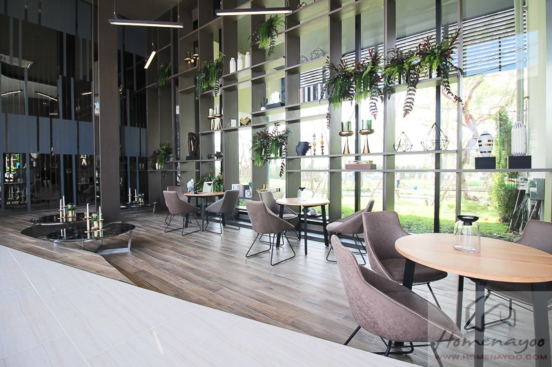 พื้นที่นั่งพักผ่อนภายในสำนักงานขาย ออกแบบและตกแต่งแนว Urban Courtyard