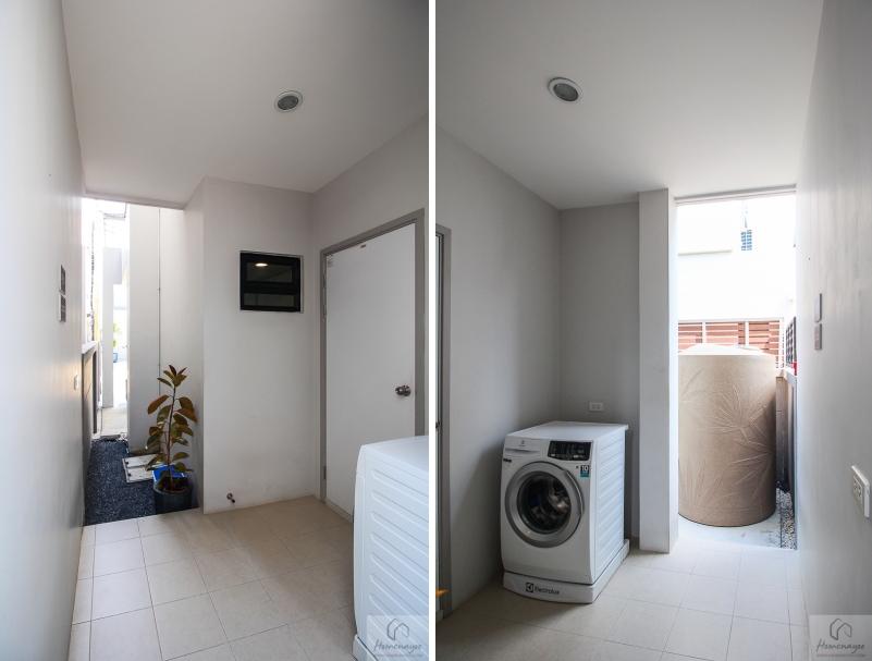 ข้างบ้านฝั่งนี้จะมีส่วนซักล้างแบบในร่ม กำแพงส่วนนี้จะเชื่อมกับบ้านอีกหลังนั่นเองครับ มีประตูเชื่อมเข้าส่วนครัวในบ้านได้
