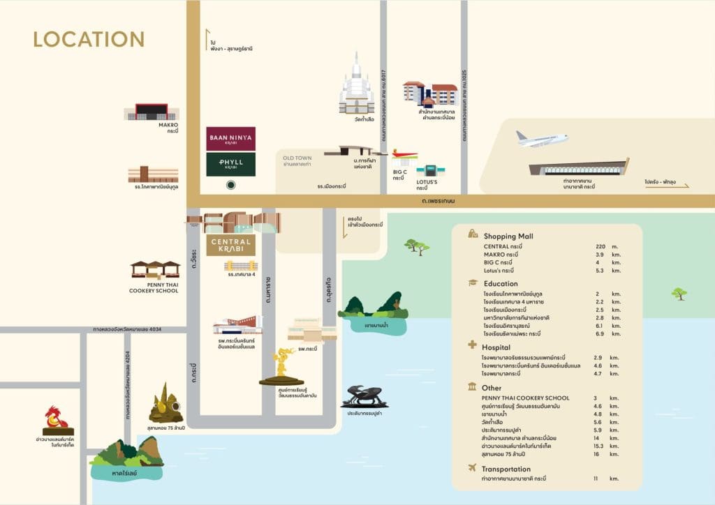 รอบ ๆ โครงการรายล้อมด้วยสถานที่สำคัญต่าง ๆ ครบครัน เช่น Central กระบี่, Makro กระบี่, Big C กระบี่, Lotus’s กระบี่, รร.โภคาพานิชย์นุกุลมูลนิธิ, รร.สาธิตกระบี่, รร.เมืองกระบี่, รพ.กระบี่นครินทร์ อินเตอร์เนอชั่นเนล, รพ.จริยธรรมรวมแพทย์กระบี่ และ รพ.กระบี่