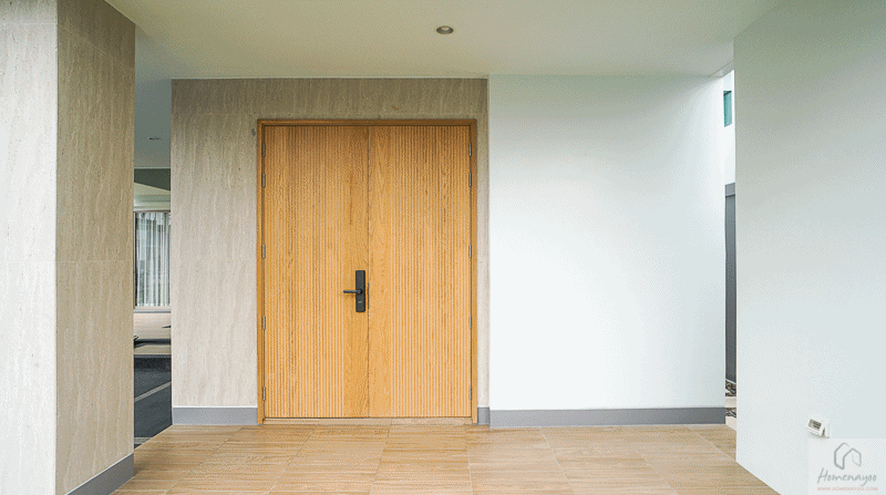 ประตูบ้านบานไม้พร้อม Digial Door Lock ของ Philips ประตูบานคู่เปิดได้กว้างใช้งานสะดวก หน้าประตูมีเฉลียงขนาดใหญ่ วางม้านั่งหรือวางชั้นวางรองเท้าเพิ่มก็ได้