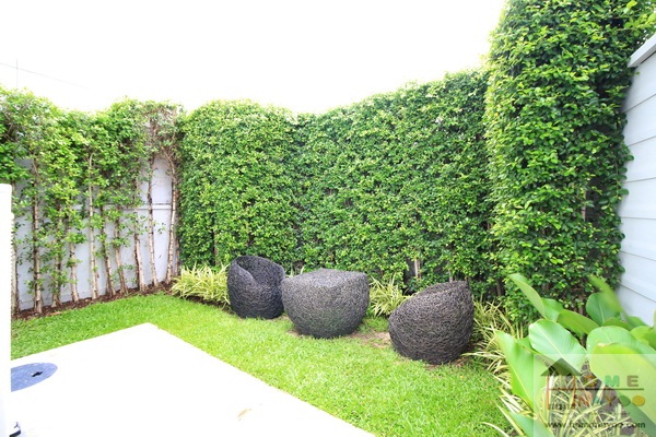 สามารถเดินเชื่อมต่อกับพื้นที่หลังบ้านได้ | โดยพื้นที่หลังบ้านจัดเป็นสวนพักผ่อน ตกแต่งต้นไม้แนวสูง วางชุดเก้าอี้หวาย บรรยากาศร่มรื่น