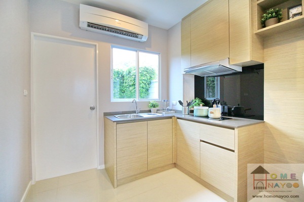 ถัดจากมุมทานอาหาร เป็นมุมครัว โครงการจัดเป็นครัวยุโรปแบบเปิด เหมาะสำหรับทำอาหารเบา ๆ บิวท์อินเคาน์เตอร์ครัว L-Shape เข้ามุมบ้านพอดิบพอดี มีหน้าต่างกระจกบานเลื่อน สำหรับเปิดระบายอากาศ เวลาทำอาหาร ทั้งยังช่วยรับแสงธรรมชาติได้อย่างดี ติดกันมีประตูเชื่อมต่อไปยังพื้นที่ซักล้างหลังบ้านได้สะดวกค่ะ