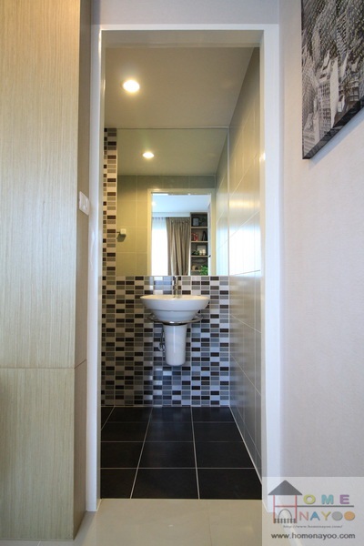 ทางขวามือ พื้นที่ลึงลงไป เป็นมุมอ่างล้างหน้า ติดอ่างแบบแขวนผนัง มีราวสแตนเลสล้อมอีกชั้น สามารถแขวนผ้าขนหนู ผ้าเช็ดมือได้ ก็อกน้ำโครเมียมก้านโยก รวมถึงติดตั้งกระจกส่องหน้า บานใหญ่ กว้างและสูง เต็มผนังให้ครบ*