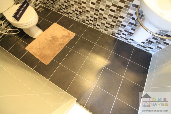 เข้ามาในห้องน้ำ พื้นห้องน้ำปูกระเบื้องสีดำ ปนังกระเบื้องลายโมเสก | แบ่งการใช้งานเป็นรูปตัว L แยกส่วนอ่างล้างหน้า, โถสุขภัณฑ์ และ ส่วนอาบน้ำ ชัดเจน