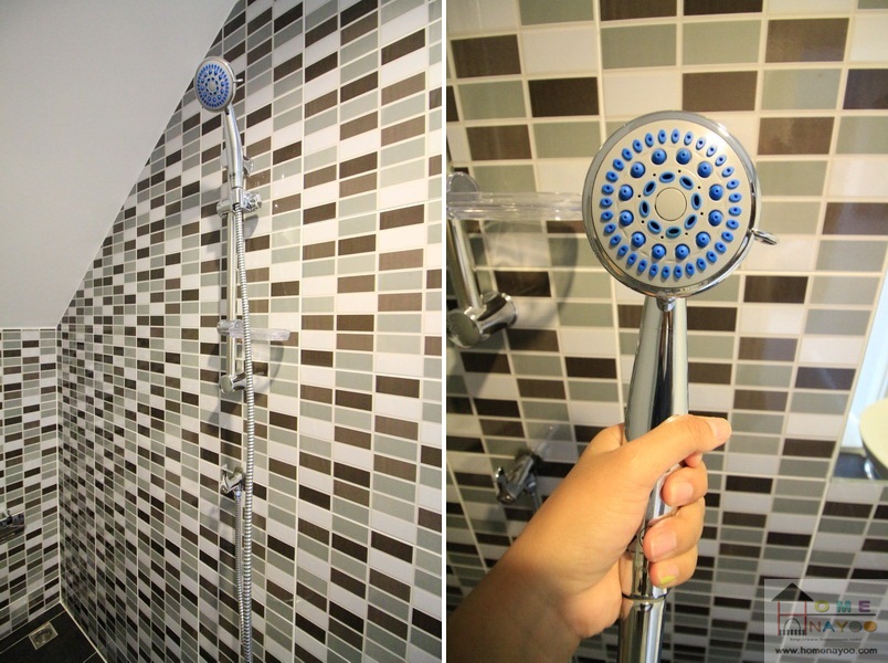 ฝักบัวฝังกำแพง ติดตั้งแบบ Hand Shower สายโครเมียม มีราวปรับระดับสูง-ต่ำ พร้อมที่วางสบู่ ก็อกน้ำก้านโยก ใช้งานง่ายค่ะ