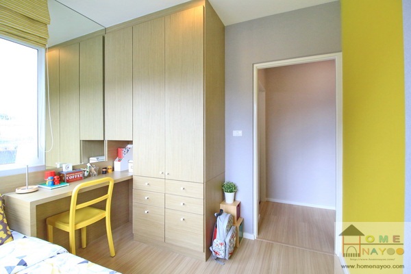 ห้องนอน 3 ตกแต่งโทนสีอ่อน ใช้สีเหลืองสลับสีขาว ดูอ่อนหวาน เพิ่มความเข้มด้วยเฟอร์นิเจอร์ลายไม้ เช่นเดียวกัน
