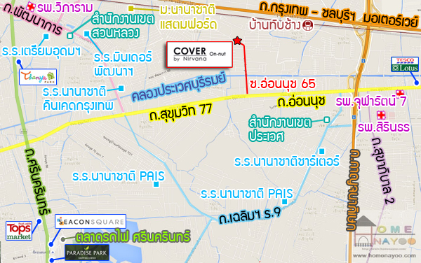 เลี้ยวเข้า ซ.อ่อนนุช 65 ตรงไปอีก 1 กม. ถึงโครงการ NIRVANA COVER อ่อนนุช