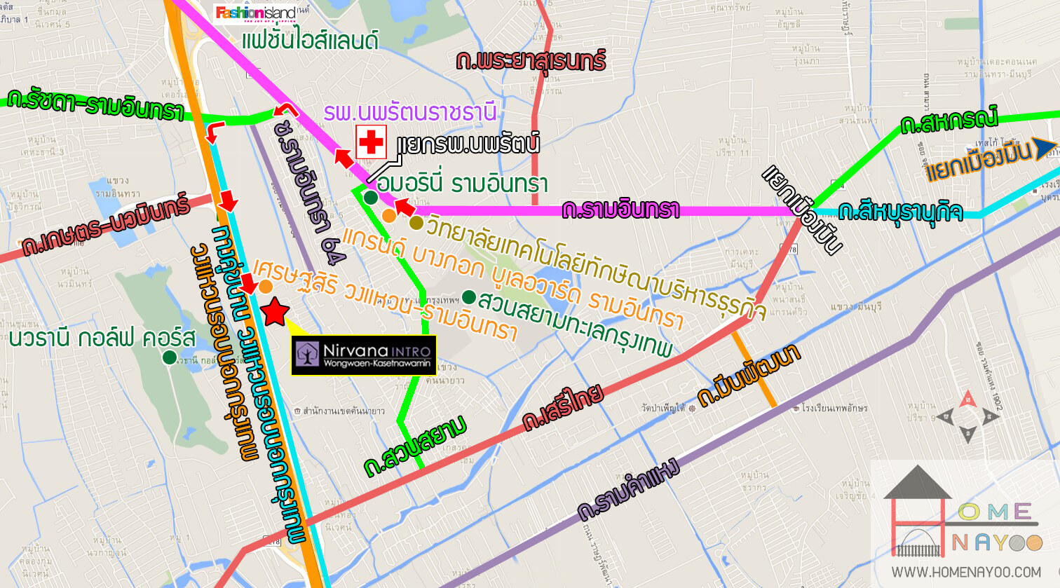 จากนั้นวิ่งตรงตาม ถนนรามอินทรา ผ่านขวามือ โรงพยาบาลนพรัตนราชธานี