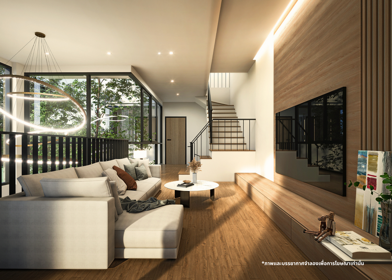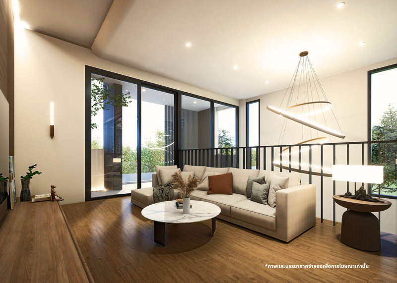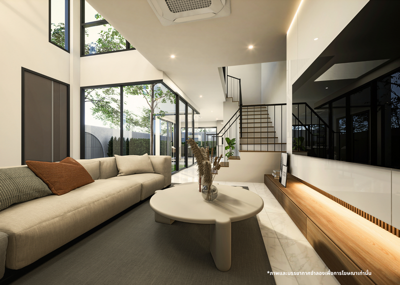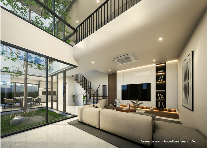 ภาพและบรรยากาศจำลองภายในบ้าน ได้เพดานสูงแบบ Double Volume บริเวณ Living Area