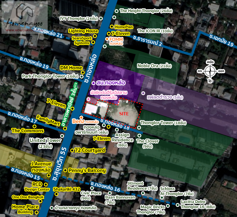 ภาพมุมสูงที่ดินโครงการ Noble Form ทองหล่อ ตั้งอยู่ติดถนนซอยทองหล่อ ทางฝั่งทิศตะวันตก ตรงข้ามจะเป็นอาคารพาณิชย์ 3-3.5 ชั้น ที่เปิดเป็นร้านค้า และ ร้านอาหาร ฝั่งทิศใต้ จะติดกับซอยทองหล่อ 18 และ โชว์รูม Mercedes-Benz ทองหล่อ