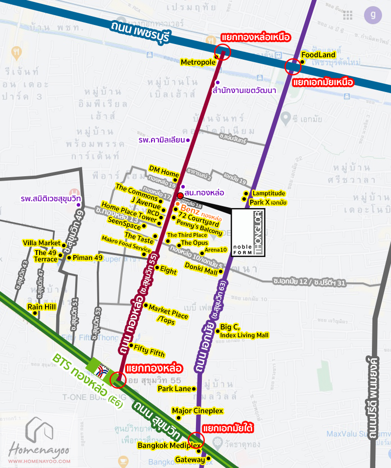 ภาพรวมของทำเลโครงการ โนเบิล ฟอร์ม ทองหล่อ ตั้งอยู่ในย่านที่คนไทย นักเดินทางต่างชาติ และ ชาวต่างชาติที่ทำงานในเมืองไทย โดยเฉพาะชาวญี่ปุ่นต่างให้ความนิยมมายาวนาน เพราะมีความสะดวกหลายประการ ตลอดสองฝั่งซอยทองหล่อ อัดแน่นไปด้วย Community Mall และ ร้านอาหารชั้นเลิศหลากหลายสัญชาติ