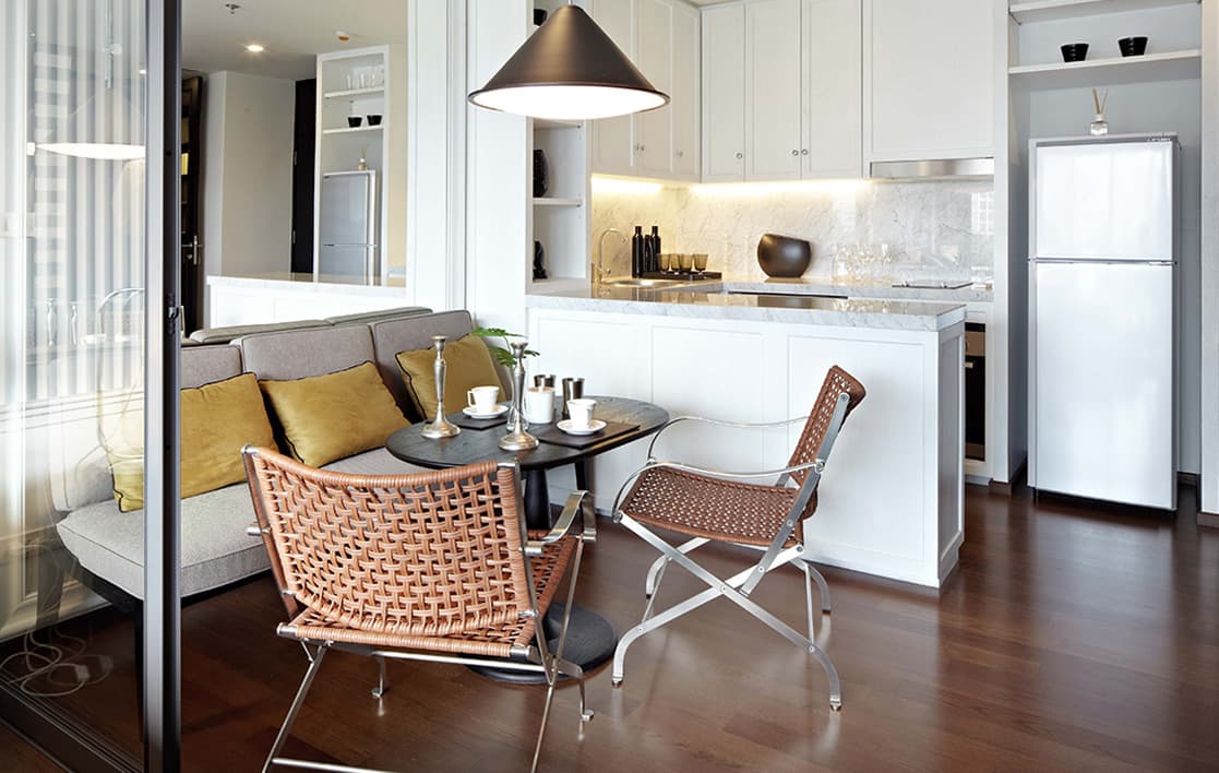 ภาพถ่ายห้องตัวอย่าง บริเวณห้องครัว และห้องนั่งเล่น มองออกมาจากห้องนอนของห้อง 1 Bedroom จากโครงการ ให้เห็ความเชื่อมต่อของพื้นที่ และความลงตัวของฟังก์ชั่น