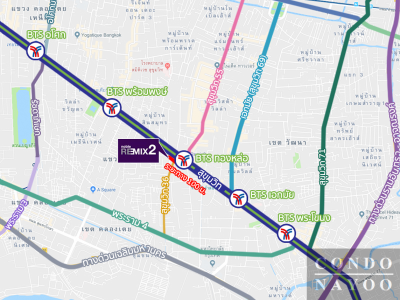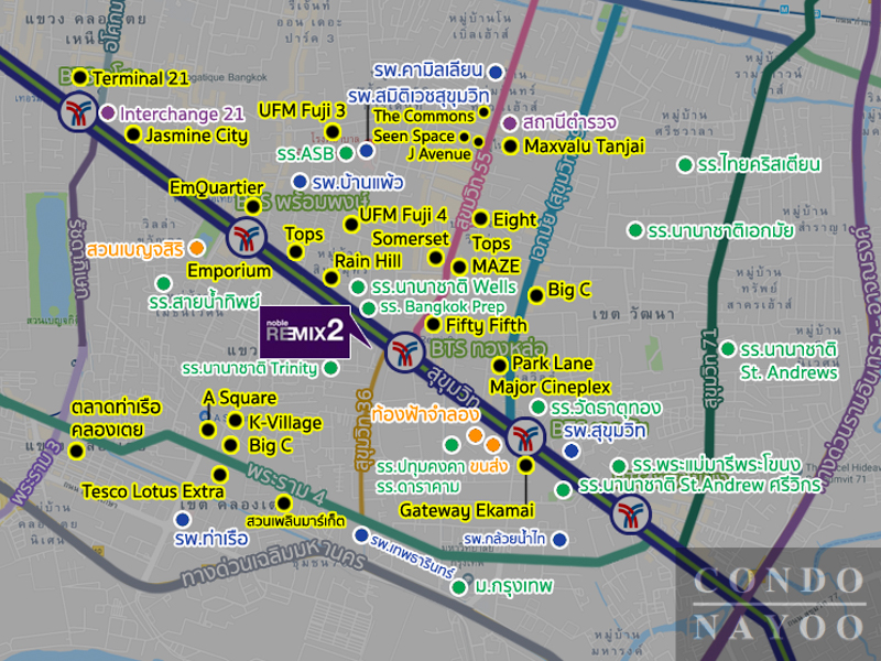 จากแผนที่ของทางโครงการ Noble Remix ทองหล่อ ตั้งอยู่บนถนนสุขุมวิท ใจกลางเมือง ติด BTS ทองหล่อ และ ซ.สุขุมวิท 36 อยู่ในทำเลศูนย์กลางความเจริญของสังคมเมือง มีระบบสาธารณูประโภค – ขนส่งสาธารณะ ที่สะดวกสบาย ครบครัน ใกล้ศูนย์กลางธุรกิจ – สำนักงาน ย่านพร้อมพงษ์, อโศก, เพลินจิต, ชิดลม มีเส้นทางเชื่อมต่อไปยัง สีลม – สาทร ใกล้รถไฟฟ้า MRT สถานีสุขุมวิท, รถไฟฟ้า ARL สถานีรามคำแหง และรถไฟฟ้าสายสีเทาในอนาคต การเดินทางโดยรถส่วนตัวนอกจากเส้นสุขุมวิท ก็สามารถใช้เส้นเพชรบุรีตัดใหม่ และพระราม 4 ใกล้ทางด่วนศรีรัช, รามอินทรา-อาจณรงค์ และเฉลิมมหานคร