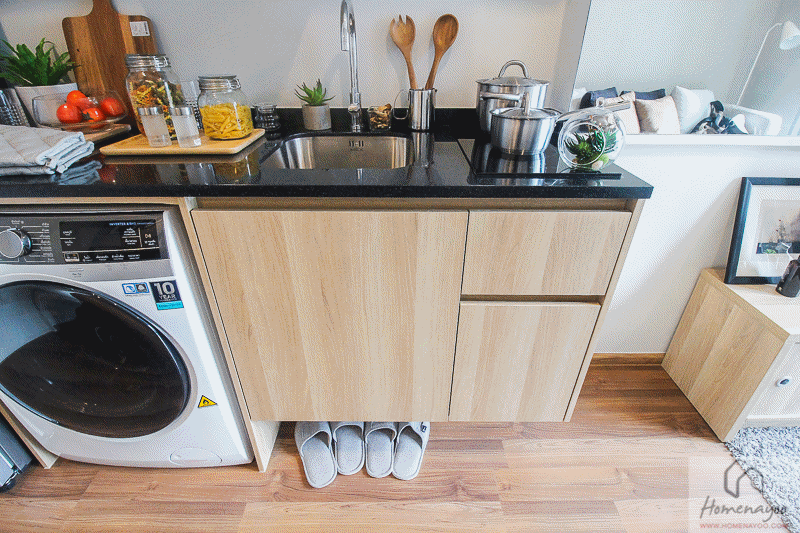 ด้านล่างแบ่งเป็นช่องวางเครื่องซักผ้า, ตู้เก็บของใต้อ่างและลิ้นชักมีช่องแยกช้อน,ส้อม