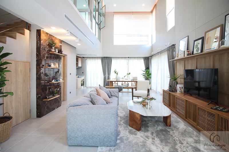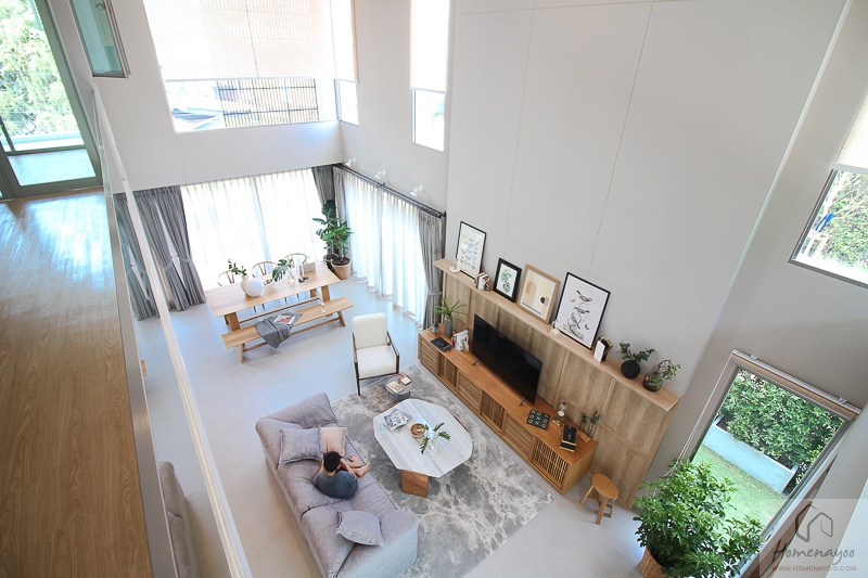 ส่วนโถงใหญ่นี้มีฝ้าเพดานที่สูงถึง 6 เมตร เชื่อมต่อพื้นที่ชั้น 1 กับพื้นที่ชั้นลอยให้ Flow ถึงกัน ได้ความโปร่งโล่งและความเชื่อมต่อของพื้นที่ทั้งแนวนอนและแนวตั้งที่แตกต่างจากทาวน์โฮมทั่วไป สามารถรับแสงจากธรรมชาติได้มากพอโดยที่เวลากลางวันไม่จำเป็นต้องเปิดไฟเลยก็ได้