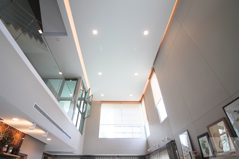 ที่ฝ้าเพดานเป็นฝ้าฉาบเรียบทาสี ติดดวงโคมดาวน์ไลท์หลอด LED จาก Philips มาให้ รอบๆ มีการซ่อนไฟเอาไว้สร้างความสวยงาม สังเกตที่ระดับความสูงของฝ้าชั้น 1 ทางโครงการติดโคมไฟ Spotlight ให้เพิ่มเติม เพราะด้วยความสูงฝ้าถึง 6 เมตร ในเวลากลางคืนที่ต้องการแสงสว่าง แสงไฟจากฝ้าเพดานอาจไม่เพียงพอค่ะ นอกจากนี้ทางโครงการยังติดตั้งแอร์แบบ Duct Type ซ่อนใต้ฝ้า ยี่ห้อ Daikin มาให้ ทั้งหมดนี้ทำให้งานโดยรวมของบ้านดูเรียบร้อยมาก