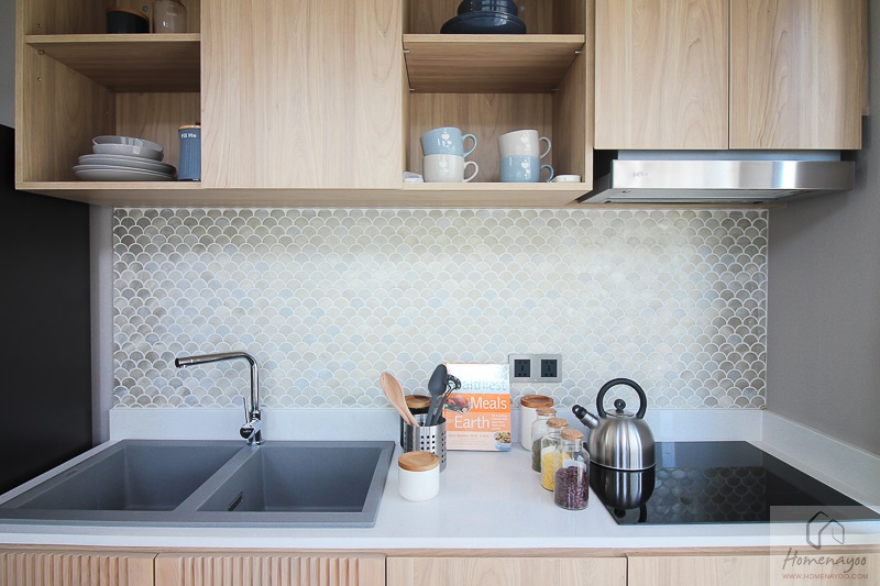 Top เคาน์เตอร์ใช้หินควอทซ์เช่นเดียวกับชั้นล่าง แต่ใต้เคาน์เตอร์จะไม่ได้ทำ Built – in มาให้นะ