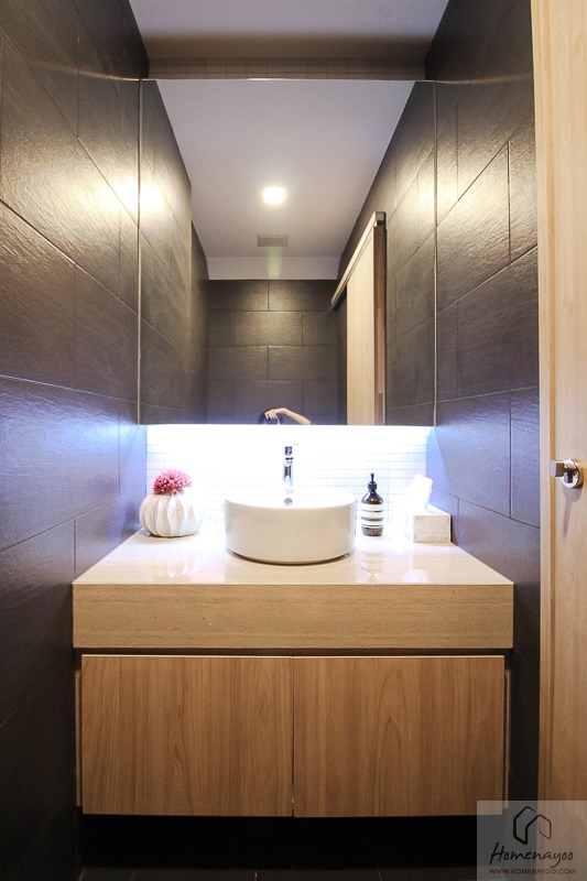 บริเวณเคาน์เตอร์กว้าง สามารถวางอุปกรณ์อาบน้ำได้เต็มที่ มาพร้อมอ่างล้างมือขนาดใหญ่ของ TOTO ฝังบน Top เคาน์เตอร์เป็นหินควอทซ์