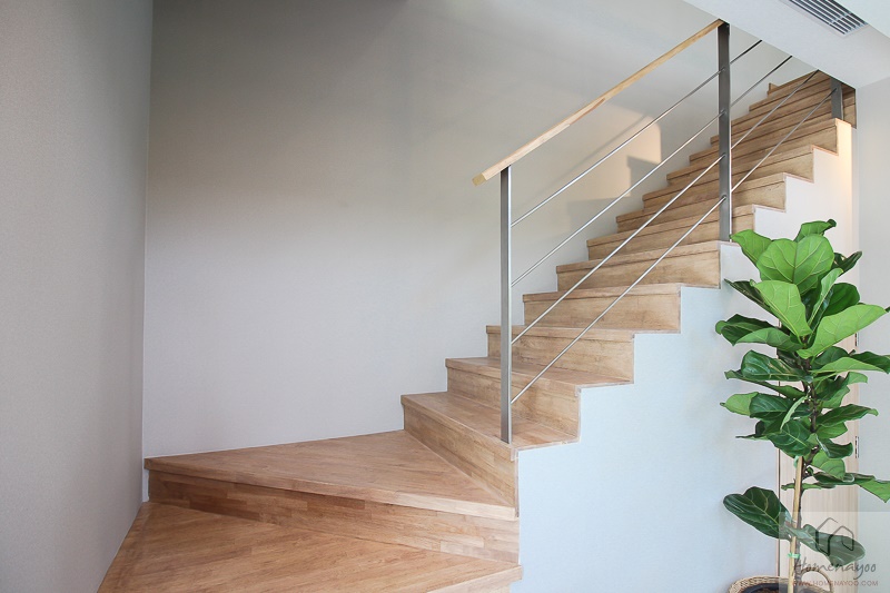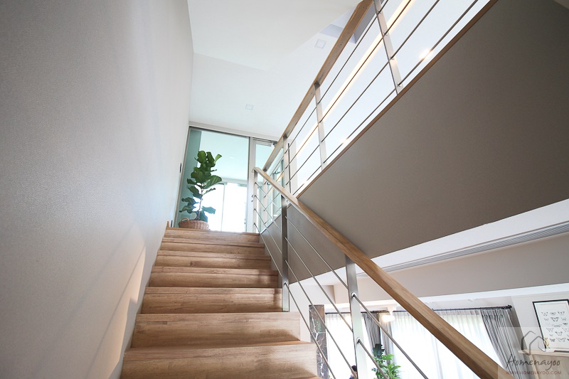 บันไดทางขึ้นชั้น 2 ฝั่งซ้ายมือติดผนังของตัวบ้าน ใช้วัสดุปิดผิวและราวจับแบบเดียวกับด้านล่างค่ะ