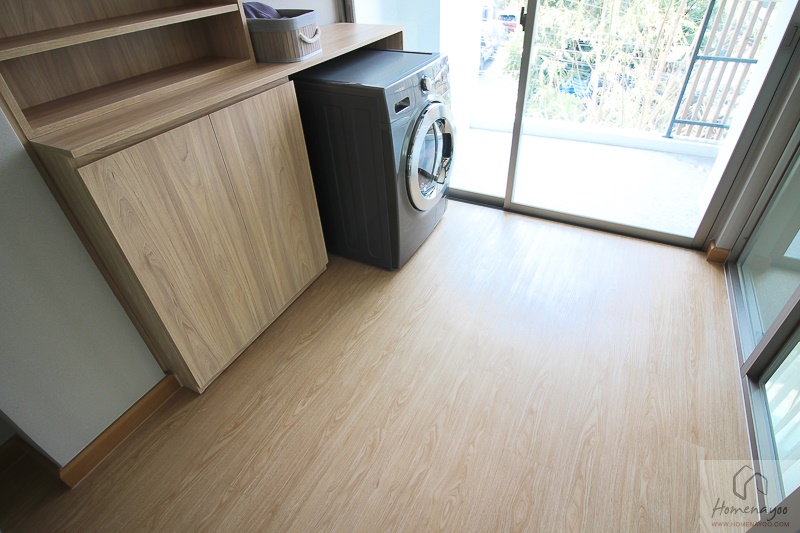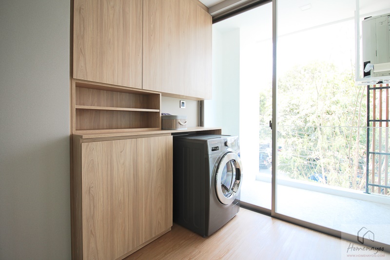 ภายในห้อง ทางโครงการได้วางตู้ Built – in และเครื่องซักผ้ามาให้ดูเป็นไอเดีย ข้อดีของห้องนี้ก็คือ มีพื้นที่ติดกับระเบียงกั้นส่วนด้วยประตูบานเลื่อน ซึ่งสามารถใช้เป็นพื้นที่ตากผ้าได้เลย