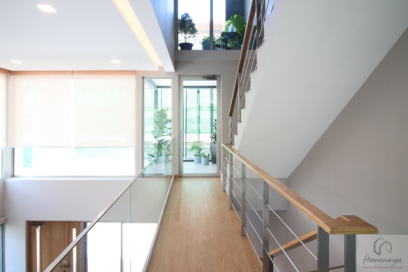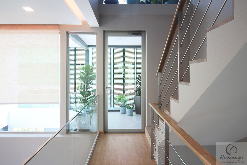 ตรงโถงบันไดตรงนี้เป็นมุมโปรดของผู้เขียนเลยนะคะเพราะเราจะสามารถเห็นสวนและต้นไม้สีเขียวบริเวณระเบียงจากตรงชั้นลอยและชั้น 2 ได้พร้อมๆ กัน เป็นมุมที่สามารถมานั่งแอบอ่านหนังสืออ่านเล่น หรือนั่งมองต้นไม้เงียบๆ ได้