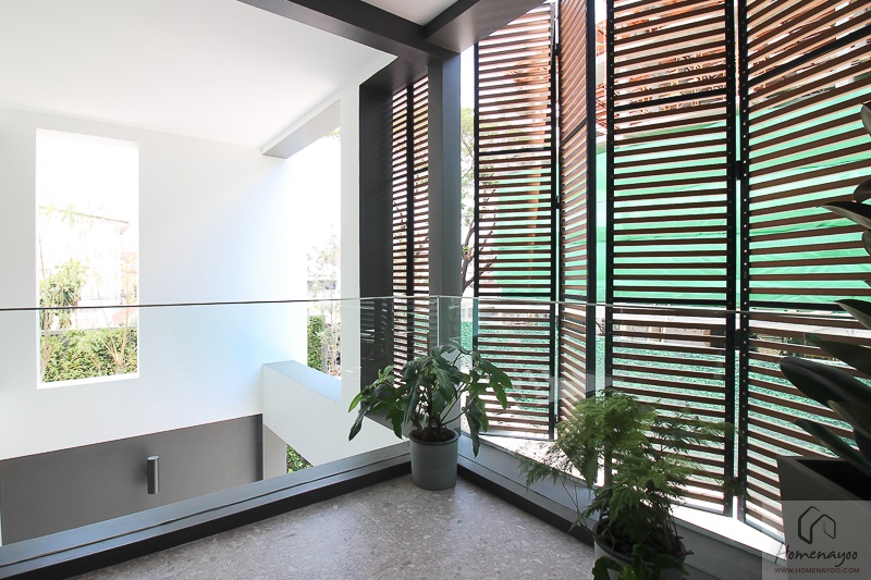 ภาพรวมของบ้านจึงดู Modern ทันสมัยแบบ Minimal ใช้สีขาวและเทาเป็นหลัก แต่ก็ยังได้ความอบอุ่นจากสีสันของระแนงไม้ ซึ่งระแนงไม้ส่วนนี้ไม่ได้เป็นเพียงแค่ส่วนตกแต่งเท่านั้นนะคะ แต่ยังเป็นส่วนที่ช่วยกันแดดทำให้บ้านเย็นขึ้น และช่วยบังสายตาจากเพื่อนบ้านทำให้ได้ความเป็นส่วนตัวมากขึ้นด้วย