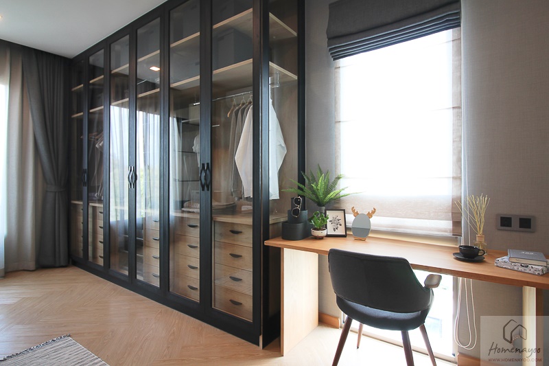 ทางโครงการวางชุด Built – in ตู้เสื้อผ้าขนาดใหญ่มาให้ดูเป็นไอเดีย บ้านแปลงมุมจะมีหน้าต่างด้านข้างมาให้ ส่วนบ้านมาตรฐานจะไม่มีหน้าต่างนะคะ เราสามารถทำตู้ยาวจนถึงเตียงได้เลยหากไม่ต้องการวางโต๊ะทำงาน