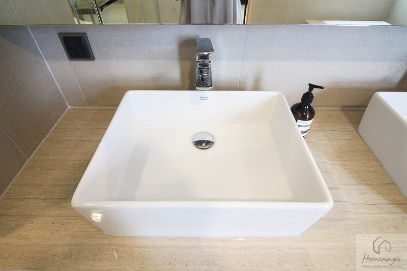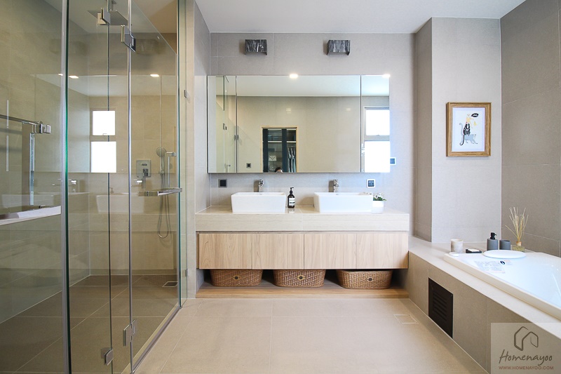 ห้องน้ำที่ทางโครงการออกแบบมาให้มีขนาดที่ใหญ่และโปร่งโล่ง มีการแบ่งโซนเปียก – แห้งให้ใช้งานได้สะดวก เพราะห้องน้ำก็เป็นอีกฟังก์ชั่นหนึ่งที่ทั้งคุณผู้ชายและคุณผู้หญิงใช้เวลาอยู่ในนี้นานๆ วัสดุภายในห้องน้ำส่วนพื้นและผนังใช้กระเบื้องพอร์ซเลนผิวหน้าหยาบแบบ Non Slip ไม่ลื่น ทนทานต่อการใช้งานและการทำความสะอาด