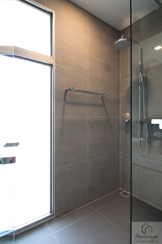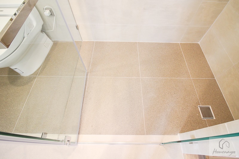 ส่วนฝั่งซ้ายมือทางโครงการได้ติดฉากกั้นกระจก Tempered Glass มาให้เรียบร้อย พื้นห้องน้ำทั้งหมดจะเรียบเสมอกัน จึงไม่ต้องกลัวว่าจะสะดุดหกล้มค่ะ