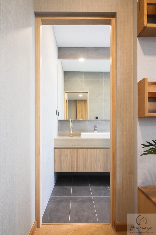 ตรงกลางห้องเป็นส่วนของอ่างล้างมือแบบ His & Her สามารถใช้งานพร้อมกัน 2 คนได้ พร้อมตู้กระจกซ่อนไฟ ส่วนด้านบนตู้กระจกก็มีไฟติดผนังมาให้อีก 2 ดวงด้วย