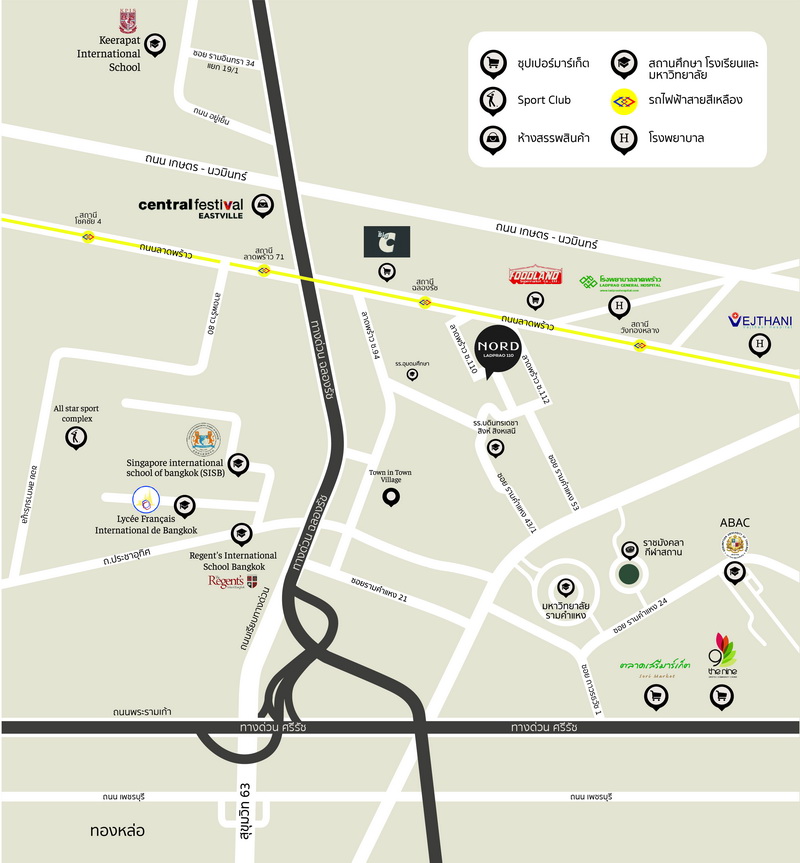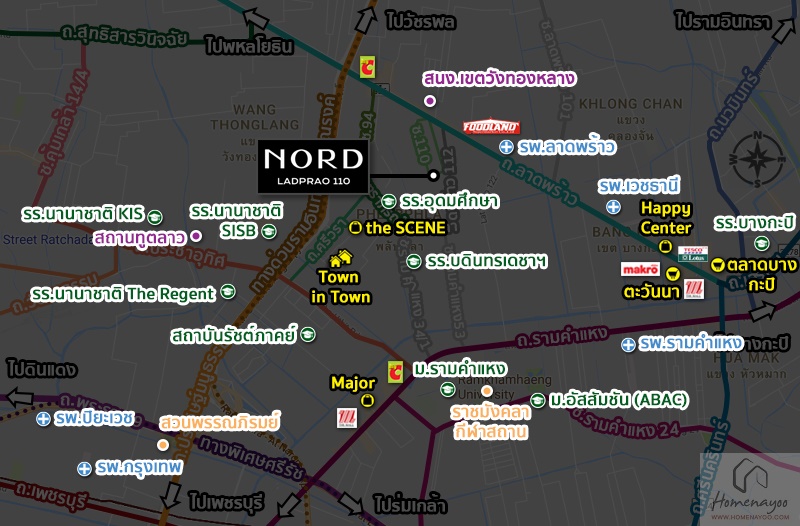 แผนที่จากทางโครงการ Nord ลาดพร้าว 110 ตั้งอยู่ใน ซอยลาดพร้าว 110 แยก 4 ใกล้ย่านทาวน์อินทาวน์ ใกล้กับสถานีรถไฟฟ้าถึง 4 สาย และอยู่ใกล้แหล่งช็อปปิ้งชั้นนำทั้ง The Crystal, CDC, Central พระราม 9 และ Central Eastville