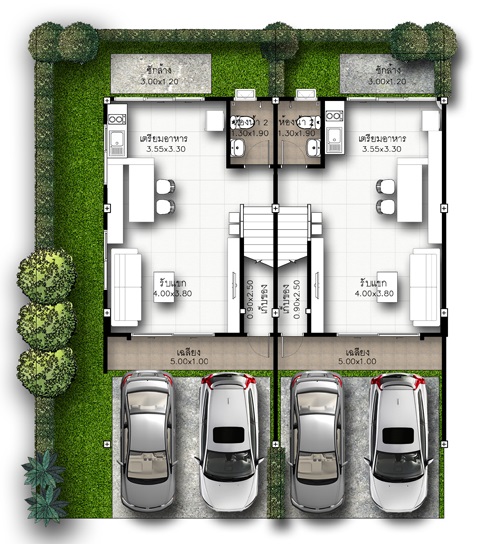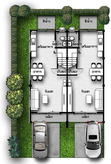 แปลนชั้น 1 : หน้าบ้านจอดรถได้ 2 คัน พื้นที่ชั้นล่างแบ่งออกเป็น 3 ส่วนเริ่มจากช่วงแรกเป็นห้องรับแขก ขยับไปช่วงตรงกลางทำเป็นห้องทานอาหาร และช่วงท้ายสำหรับห้องครัว ห้องน้ำชั้นล่างอยู่ด้านหลังของบ้านมีข้อดีคือ ทำให้ภายในหองน้ำมีช่องรับแสงและระบายอากาศ หลังบ้านเป็นลานซักล้าง