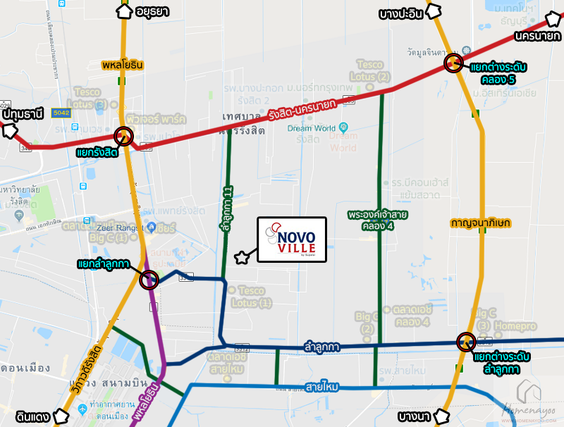 เส้นทางที่ผมใช้เดินทางไปยังโครงการในวันนี้ ผมใช้เส้นทางถนนวิภาวดีรังสิต วิ่งฝั่งมุ่งหน้าขาออกไปทางรังสิต ผ่านสนามบินดอนเมืองไปจนถึงบริเวณแยกต่างระดับอนุสรณ์สถาน ให้ขึ้นสะพานเพื่อไปยังทางเข้าถนนลำลูกกา จากถนนลำลูกกาให้เลี้ยวซ้ายเข้าสู่ถนนลำลูกกา 11 แล้วเลี้ยวขวาอีกครั้งเพื่อเข้าซอยลำลูกกา 11/14 ซึ่งเป็นที่ตั้งโครงการ โนโว วิลล์ พหลโยธิน-ลำลูกกา